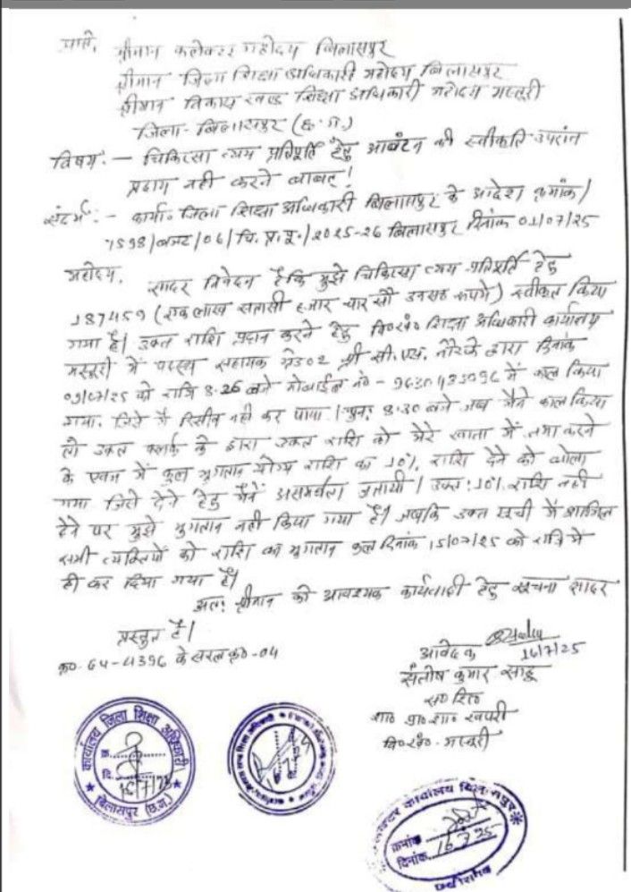 खबर खास छत्तीसगढ़ बिलासपुर। मेडिकल बिल भुगतान मामले में बिल्हा बीईओ कार्यालय लाखों रुपए के फर्जी बिल भुगतान मामले में जाँच से कछुए की चाल से गुजर रहा है ऐसे में मेडिकल बिल भुगतान मामले में सीधे तौर से 10% कमीशन की मांग और रिश्वत नहीं देने पर मस्तूरी के बाबू ने भुगतान रोका जिसकी लिखित शिकायत कलेक्टर, डीईओ और बीईओ से करने के बाद भी कार्यवाही नहीं का नहीं होना व्यवस्था पर सवाल खड़े करता नजर आता है।