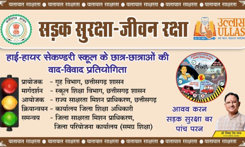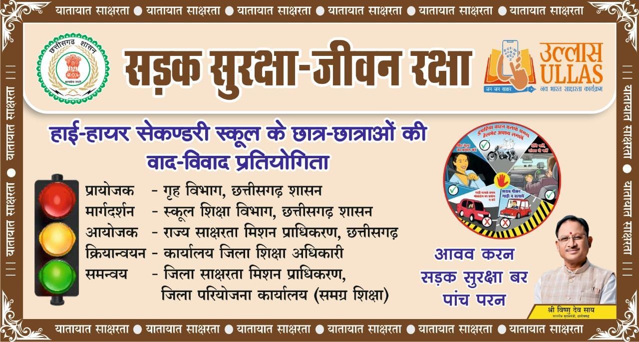 स्कूल शिक्षा विभाग साक्षरता मिशन प्राधिकरण के मार्गदर्शन में गृह विभाग छत्तीसगढ़ शासन के वित्तीय सहयोग से प्राधिकरण द्वारा सड़क सुरक्षा के महत्व को समझने एवं यातायात के नियमों के पालन को अमल में लाने के लिए जनसमुदाय की भागीदारी सुनिश्चित करने के आशय से प्रदेश में ‘‘सड़क सुरक्षा जीवन रक्षा‘‘ (हेलमेट व शीटबेल्ट का उपयोग करने, तेज रफ्तार, मोबाइल से बात करते हुए एवं शराब सेवन कर वाहन न चलने तथा यातायात के नियमों का पालन करने) पर आधारित छात्र-छात्राओं के हाई-हायर सेकेंडरी स्कूल स्तर से लेकर राज्य स्तर तक विवाद प्रतियोगिता का आयोजन ग्रामीण समुदाय को जागृत करने एवं आने वाले नौजवानों के लिए यातायात शिक्षा प्रदान करने संबंधी माहिती कार्य करेगी।