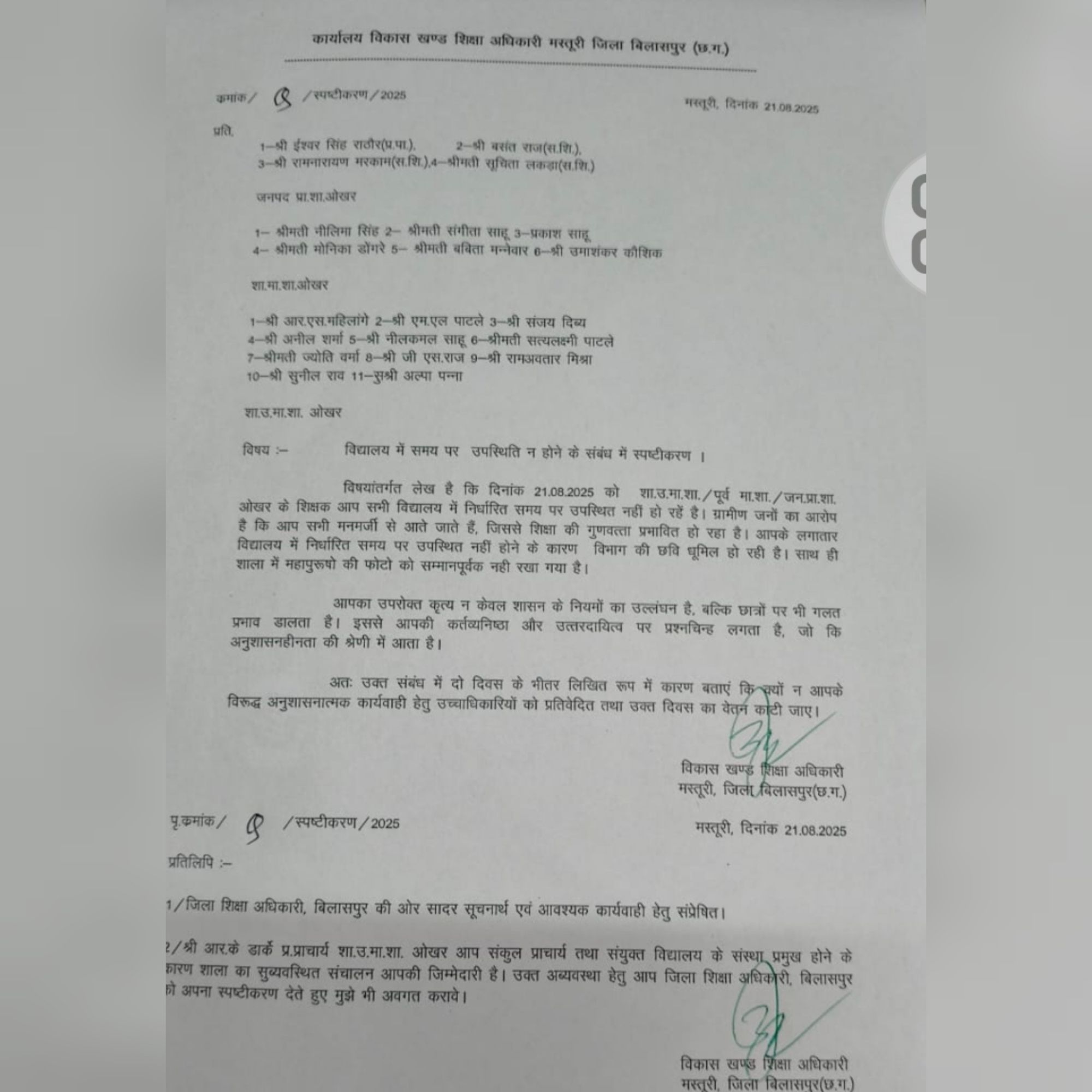 हेडिंग के साथ बड़ी प्रमुखता से खबर खास नें खबर प्रसारित किया था,शिक्षकों और व्यख्याताओं का लेट से स्कूल आने मामले पर खबर प्रसारित किए जाने से शिक्षा विभाग में हड़कंप मच गया था खबर से जिम्मेदार अधिकारी कुम्भकर्णीय नींद से जाग गए थे आखिरकार उच्च अधिकारियों की फटकार के बाद DEO नें मामले पर दो सदस्यीय टीम गठित कर 3 दिनों में जाँच प्रतिवेदन प्रस्तुत करने का आदेश दिया है वहीं मस्तूरी के BEO नें प्रायमरी और मिडिल स्कूल के प्रधान पाठक सहित शिक्षकों से पत्र जारी कर स्पष्टीकरण माँगा है।