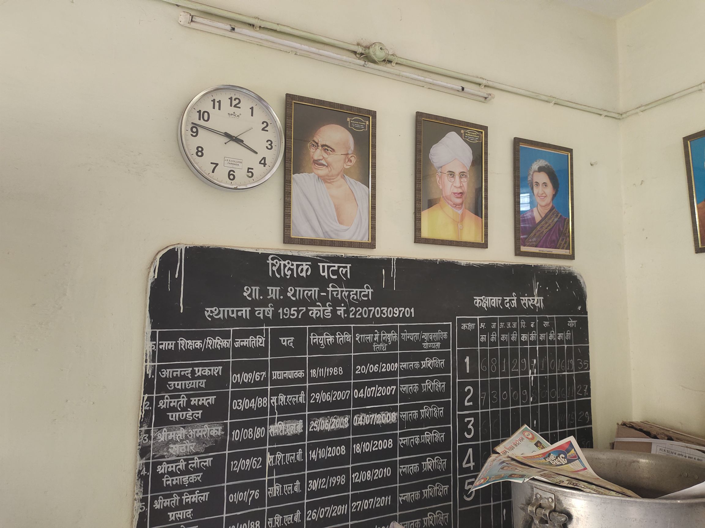 शिक्षा मंत्री जी आप यकीन मानिए सरकारी स्कूल और उनकी संचालन व्यवस्था के लिए जिम्मेदार शिक्षा विभाग के जिम्मेदार अधिकारियों और कर्मचारियों की उदासीनता और नकारेपन का ही नतीजा है कि शिक्षक मनमानी करने से भी नहीं चूकते। आप खुद महापुरुषों के साथ दीवार पर टंगी घड़ी को देखकर इनकी घोर लापरवाही का अंदाजा लगा सकते हैं। जबकि यह स्कूल शहर से लगा हुआ है।