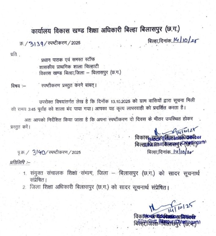 जिसे संज्ञान में लेते हुए भूपेंद्र कौशिक विकास खण्ड शिक्षा अधिकारी ने प्रधान पाठक एवं समस्त स्टॉफ शासकीय प्राथमिक शाला चिल्हाटी विकास खण्ड बिल्हा, जिला बिलासपुर (छ.ग.) स्पष्टीकरण प्रस्तुत करने बाबत् नोटिस जारी किया गया।