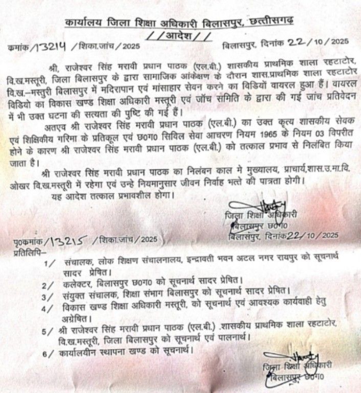22 अक्टूबर 25 को जाँच उपरांत कार्यालय जिला शिक्षा अधिकारी बिलासपुर, छत्तीसगढ़ से एक आदेश जारी किया गया जिसका कमांक/13214/ शिका.जांच 2025 बिलासपुर, दिनांक 22/10/2025 के अनुसार राजेश्वर सिंह मरावी प्रधान पाठक (एल.बी.) शासकीय प्राथमिक शाला रहटाटोर, वि.ख.मस्तूरी, जिला बिलासपुर के द्वारा सामाजिक आंकेक्षण के दौरान शास. प्राथमिक शाला रहटाटोर वि.ख.-मस्तुरी बिलासपुर में मदिरापान एवं मांसाहार सेवन करने का विडियों वायरल हुआ है। वायरल विडियो का विकास खण्ड शिक्षा अधिकारी मस्तूरी एवं जॉच समिति के द्वारा की गई जांच प्रतिवेदन में भी उक्त घटना की सत्यता की पुष्टि की गई है।