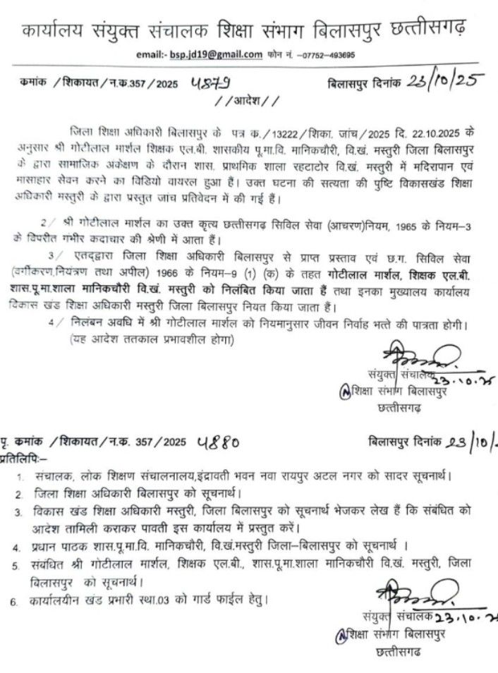 आज संयुक्त संचालक बिलासपुर नें तीसरे शिक्षक को भी सस्पेंड कर दिया है। मामला गंभीर है।
