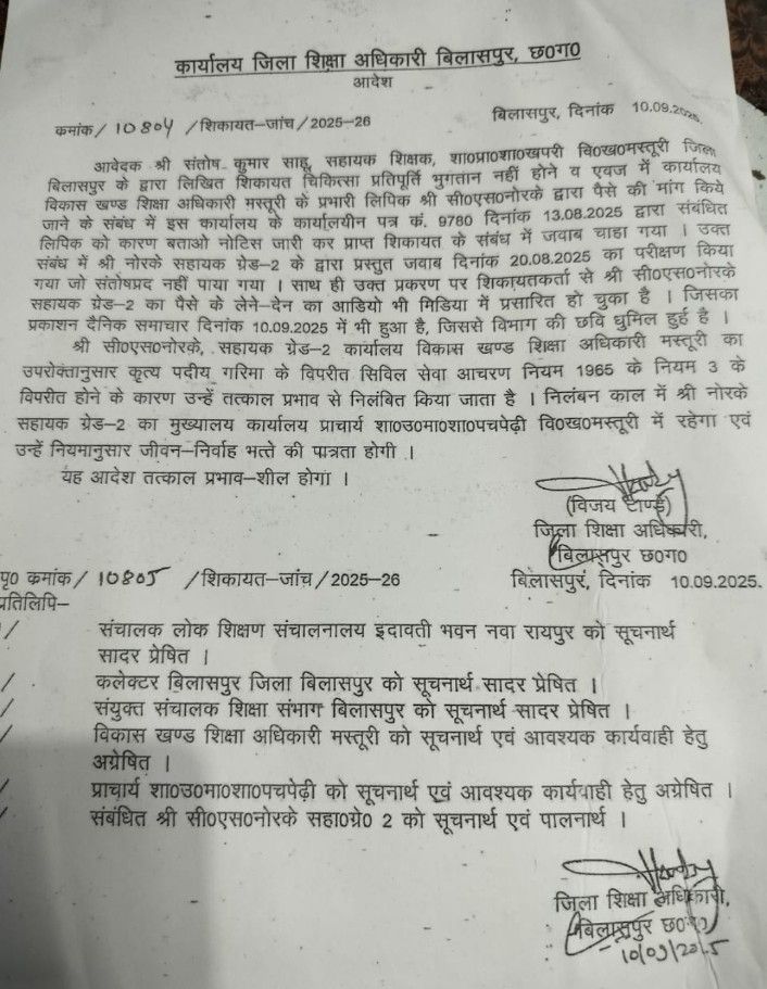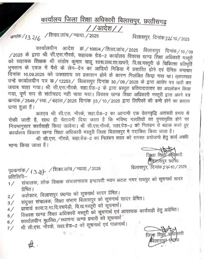 मस्तूरी विकास खण्ड शिक्षा कार्यालय के फोन पर शिक्षक से कमीशन मांगने वाले बाबू सी.एस. नौरंग (सहायक ग्रेड-2) को निलंबित कर दिया गया था निलंबन के मात्र 42 दिनों बाद भ्रष्टाचार के गढ़ मस्तूरी विकास खण्ड शिक्षा कार्यालय में बहाल कर दिया गया है। निलंबन का कारण कमीशन मांगने का ऑडियो वायरल था, लेकिन सस्पेंशन के महज 42 दिन बाद आनन फानन में सिविल सेवा आचरण नियम विरुद्ध किया गया बहाली का आदेश पर्दे के पीछे की बड़ी डील की कहानी कह रहा है।