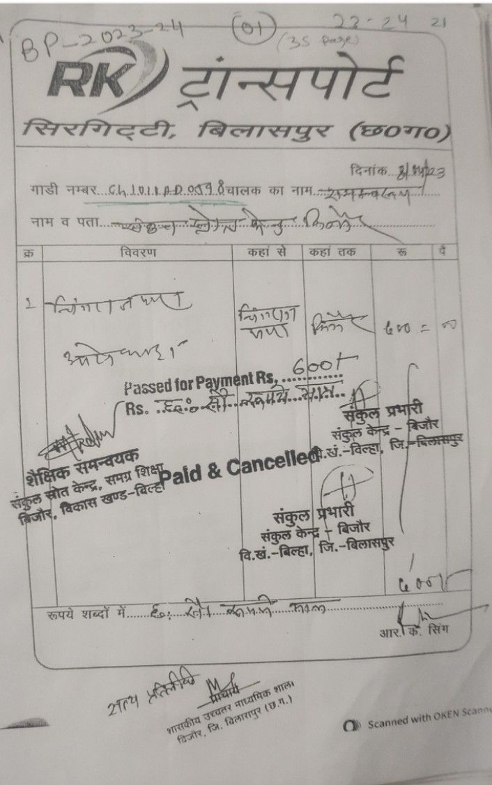 100 पृष्ठों में सूचना के अधिकार के तहत प्राप्त दस्तावेज जिसका अवलोकन करने पर संकुल प्राचार्य और संकुल समन्वयक बिजौर नें स्थानीय स्तर पर शनि ट्रांसपोर्ट इमली पारा बिलासपुर,RK ट्रांसपोर्ट बिलासपुर,GLOBE ट्रेवल पुराना बस स्टैंड, बिलासपुर,RK ट्रांसपोर्ट सिरगिट्टी बिलासपुर,का बिल पिकअप,आटो से परिवहन बतलाया गया है लेकिन आश्चर्य की बात यह है कि बिल में ना तो बिल क्रमांक है ना ट्रांसपोर्टर का सम्पर्क करनें मोबाईल या फोन नम्बर डाला गया है ना ही दिए पता में ट्रांसपोर्टर का कार्यालय है और इससे भी हैरानी की बात यह है कि बिल में दर्शाया गया वाहन क्रमांक दो पहिया वाहनों का है। आगे जाँच में सच्चाई सामने आएगी।