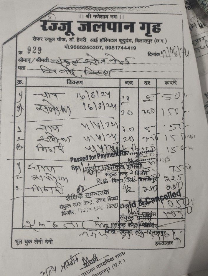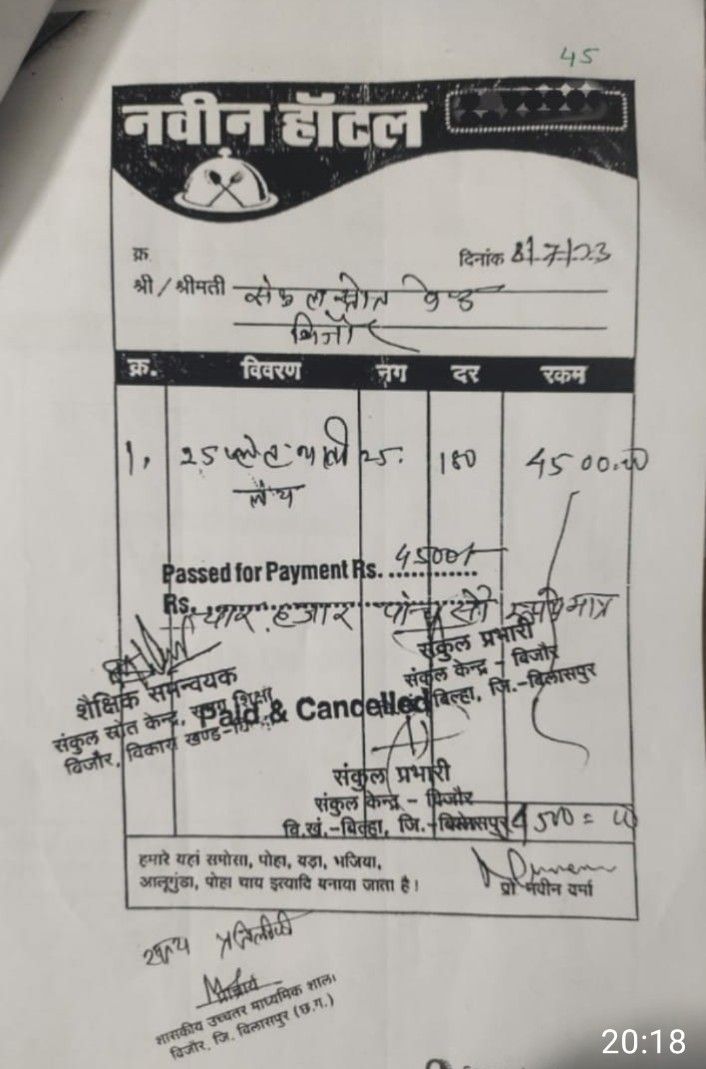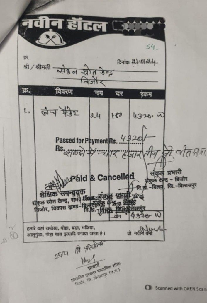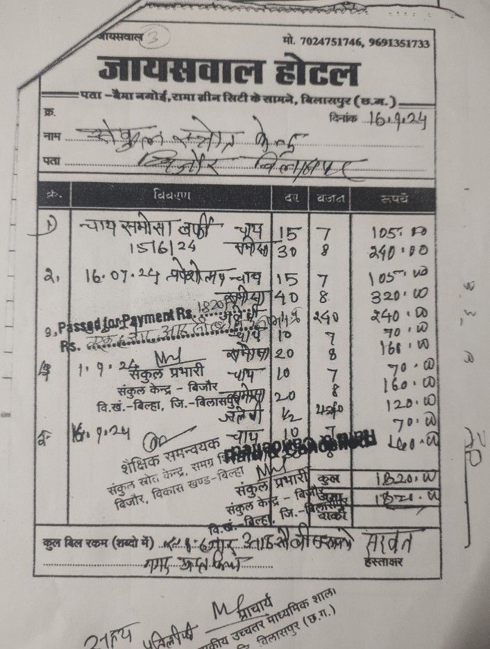 ये हम मनगढ़ंत आरोप नहीं लगा रहे,यह सूचना के अधिकार से मिले दस्तावेज से यह मामला उजागर हुआ कि संकुल केंद्र शासकीय उच्चतर माध्यमिक विद्यालय बिजौर विकास खण्ड बिल्हा जिला बिलासपुर में समग्र शिक्षा से मिली राशि का जमकर बंदरबांट हुआ है, जहां तत्कालीन संकुल प्राचार्य श्रीमती हेमलता पांडेय एवं संकुल समन्वयक मनोज सिह ठाकुर द्बारा बिना एड्रेस के एक नवीन होटल के नाम 25 प्लेट (प्रति प्लेट 180 रुपए)लंच की थाली का बिल दिनाँक 08/07/2023 और दूसरा 24 पैकेट लंच का बिल 21/01/2024 को लगाकर 4,370 और 4,500 रुपए का भुगतान बिल में दर्शाया है।