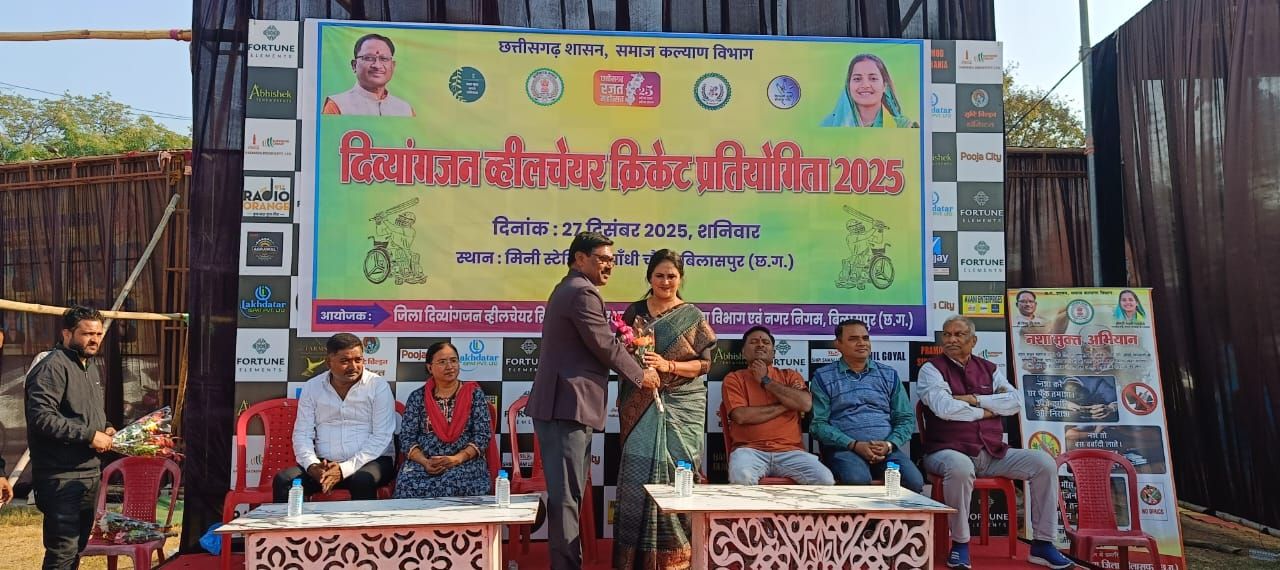खबर खास छत्तीसगढ़ बिलासपुर,27 दिसम्बर 2025/दिव्यांगो हेतु बिलासपुर में पहली बार व्हीलचेयर क्रिकेट प्रतियोगिता का आयोजन समाज कल्याण विभाग एवं नगर निगम बिलासपुर के संयुक्त तत्वधान में आज मिनी स्टेडियम खेल परिसर दयालबंद में आयोजित की गई। जिसमें बेमेतरा एवं बिलासपुर के बीच 8-8 ओवर का मैच खेला गया। पहले बैटिंग करते हुये जिला बेमेतरा ने 8 ओवर में 6 विकेट खोकर 51 रन बनाये, तत्पश्चात बिलासपुर ने बैटिंग करते हुये 6.1 आवेर में लक्ष्य प्राप्त कर लिया। इस क्रिकेट मैच का यू-ट्यूब में लाइव प्रसारण किया गया।