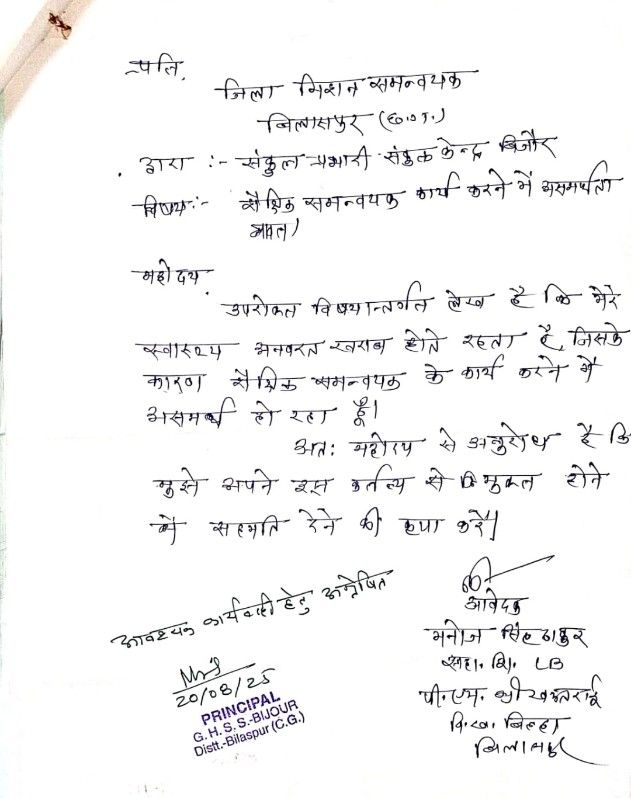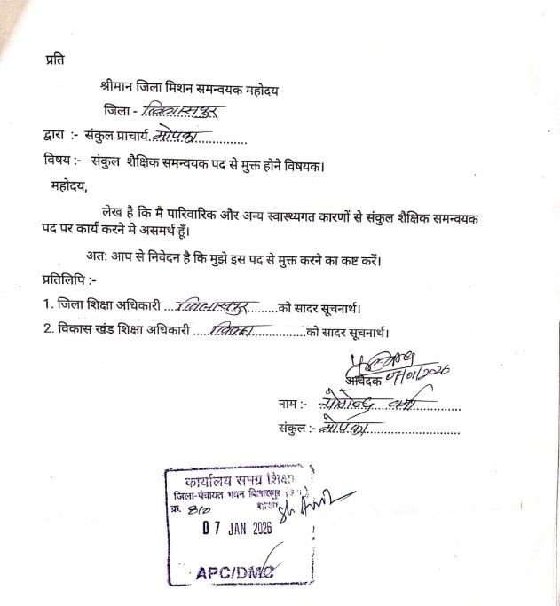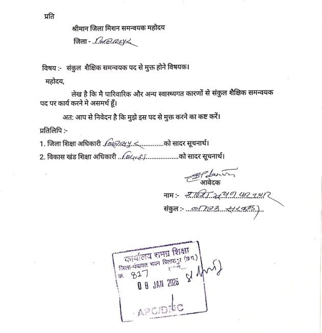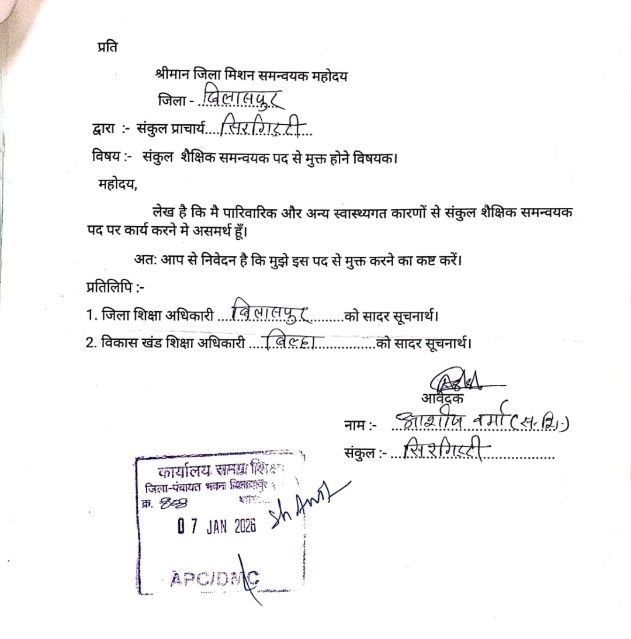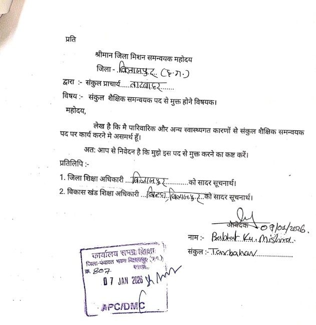 स्वास्थ्यगत और पारिवारिक कारणों से दिया गया इस्तीफा… कलेक्टर नें किया मंजूर…समस्त पंजी व दस्तावेज तीन दिवस के भीतर संकुल प्रभारी को सौंपने का आदेश। नौटंकीबाज CAC काम कर “कलेक्टर” के आदेश की उड़ा रहे धज्जियाँ! जिम्मेदारों की उदासीनता उजागर।