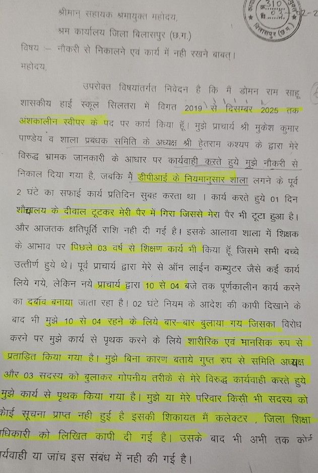 अंशकालीन सफाईकर्मी डोमन राम साहू का आरोप है कि वह शासकीय हाई स्कूल सिलतरा विकास खण्ड तखतपुर जिला बिलासपुर में वर्ष 2009 से दिसम्बर 2025 तक इस स्कूल में काम कर रहा था, और हाल ही में प्राचार्य के पद पर आए मुकेश पांडेय व शाला प्रबंधक समिति के अध्यक्ष हेतराम कश्यप के द्वारा मेरे विरुद्ध भ्रामक जानकारी के आधार पर कार्यवाही करते हुए मुझे नौकरी से निकाल दिया गया है। जबकि मैं DPI के नियमानुसार शाला लगनें के पूर्व 2 घंटे का सफाई कार्य प्रतिदिन सुबह करता था।