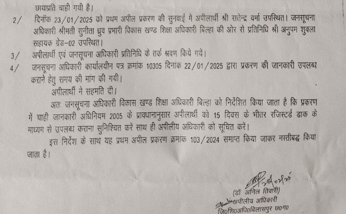 विषयांतर्गत संदर्भित पत्र के अनुक्रम में लेख है कि आपके द्वारा सूचना के अधिकार के तहत, अपीलीय अधिकारी कार्यालय जिला शिक्षा अधिकारी बिलासपुर छत्तीसगढ़ के क्रमांक 1321 / सू०अ०प्रको० / अपील प्र.क्र. 103/2024 बिलासपुर दिनांक 28/02/2025 अपील प्रकरण क्रमांक 103/2024 सरकण्डा बिलासपुर विरुद्ध जन सूचना अधिकारी कार्यालय विकास खण्ड शिक्षा अधिकारी बिल्हा जिला बिलासपुर छत्तीसगढ़ आदेश दिनांक 23/01/2025 की कंडिका चार के परिपालन में जन सूचना अधिकारी कार्यालय विकास खण्ड शिक्षा अधिकारी बिल्हा जिला बिलासपुर के द्वारा अपीलीय अधिकारी कार्यालय जिला शिक्षा अधिकारी, बिलासपुर छत्तीगढ़ में प्रस्तुत पालन प्रतिवेदन की सत्यापित छायाप्रति चाही गई है।