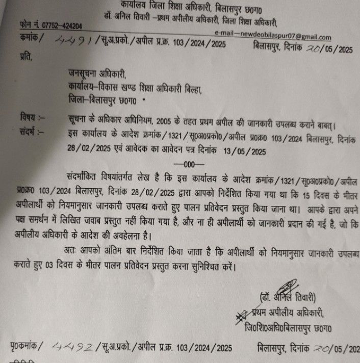 इस संबंध में 10/06/2025 को आवेदक को जिला शिक्षा अधिकारी कार्यालय से पत्र लिखकर अवगत कराया जाता है कि जन सूचना अधिकारी कार्यालय विकास खण्ड शिक्षा अधिकारी बिल्हा जिला बिलासपुर का पालन प्रतिवेदन प्रथम अपीलीय अधिकारी को प्राप्त नहीं हुआ है।